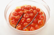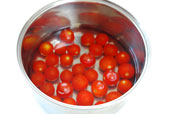 コンポート液が冷めたらトマトの皮をむいて、好みの器にいれる。 |