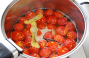 1. コンポートを作る。 ミニトマトは水洗いしヘタをとり、分量の水と、あればオレンジリキュール(今回はコアントロー)とグラニュー糖と一緒に鍋に入れる。 |