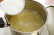 グラニュー糖とアガーはあらかじめ混ぜておき沸騰した液体を混ぜながら加え溶かす。 |