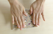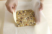 6. オーブンシートの上にシリアルを出し四角く整え上から押し平らにする。(少しつぶれるくらいきつく押す。) 真中が厚くならないよう均一にする。 |