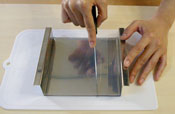 タッパー等で作った場合、一度まな板に取り出してからカットする。 |